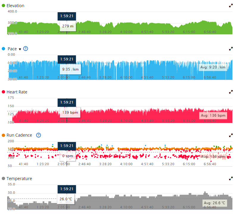 AVG HR sure rose in the last 3 6:00 intervals maxing out at 154. The last K saw a 162 bpm max , not too too far off my max HR ...yikes! I could most likely sustain in the 140's for a couple of hours however 150's, no way I would fatigue.